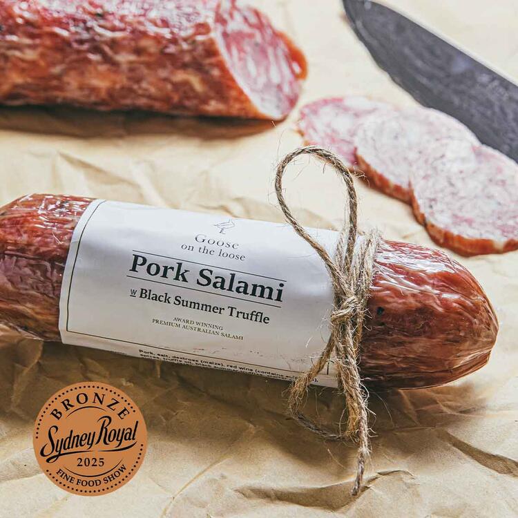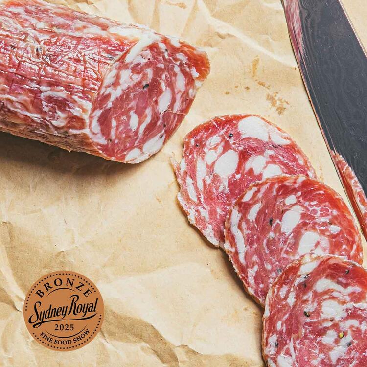 ‘Salame al Tartufo’ is a treat for special occasions, made using the finest free-range Australian Pork and imported Italian Black Summer Truffles. The reason truffles are so highly prized is the scarcity of the produce, truffles are seasonal, extremely difficult to grow and take many years to cultivate. “The King of Traditional Salami” harnesses a nutty rich, deep flavour, a little mushroomy, cured, executed and mastered with our premium pork. It’s best served with a sharp Pecorino cheese and accompanied by crisp dry white wine or European style lager.
