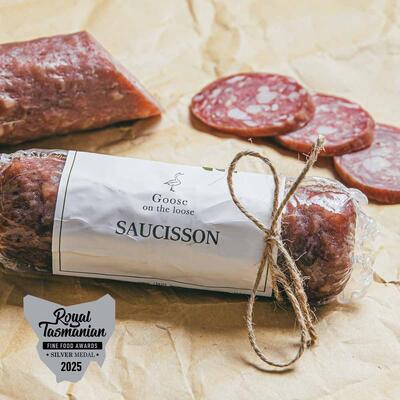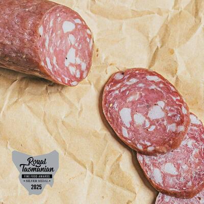 Delight in the rich, traditional flavours of our French style pork salami saucisson. Made from the finest cuts of pork, this saucisson is expertly seasoned with a blend of herbs and spices, then naturally cured to perfection. Each slice offers a robust, sweet taste with a satisfying texture that is both tender and slightly firm. The careful curing process enhances the depth of flavour, making it an ideal choice for charcuterie boards, gourmet sandwiches, or as a delectable snack on its own. Whether you’re entertaining guests or enjoying a quiet moment of indulgence, our pork salami saucisson brings a touch of artisanal craftsmanship to your table.