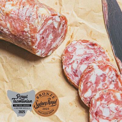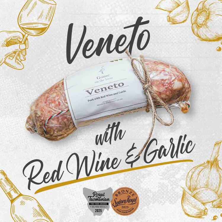 Named after the Italian region that is home to Venice and Romeo & Juliet, the Veneto Salami is made with fresh ingredients including premium free range Australian Pork and is naturally soft and noted for its lovely flavour that can only come from traditional dry curing. Blended with a subtle infusion of Red Wine, Pink Sea Salt and Cracked Pepper it’s the ideal family all rounder and always a popular choice with our Italian customers. Eat straight from the packaging sliced on a cheese board or serve in a sandwich, also great tossed through pasta or potato salad. Due to its easy going flavour profile Veneto can be enjoyed by the whole family and eaten with pretty much anything – literally!